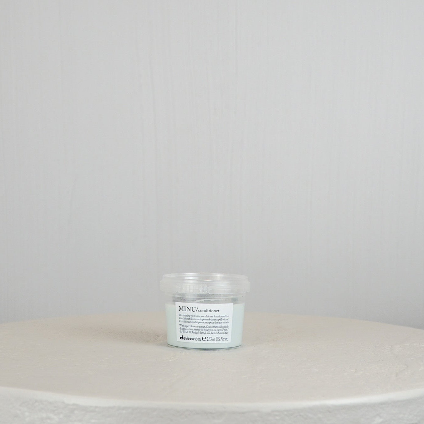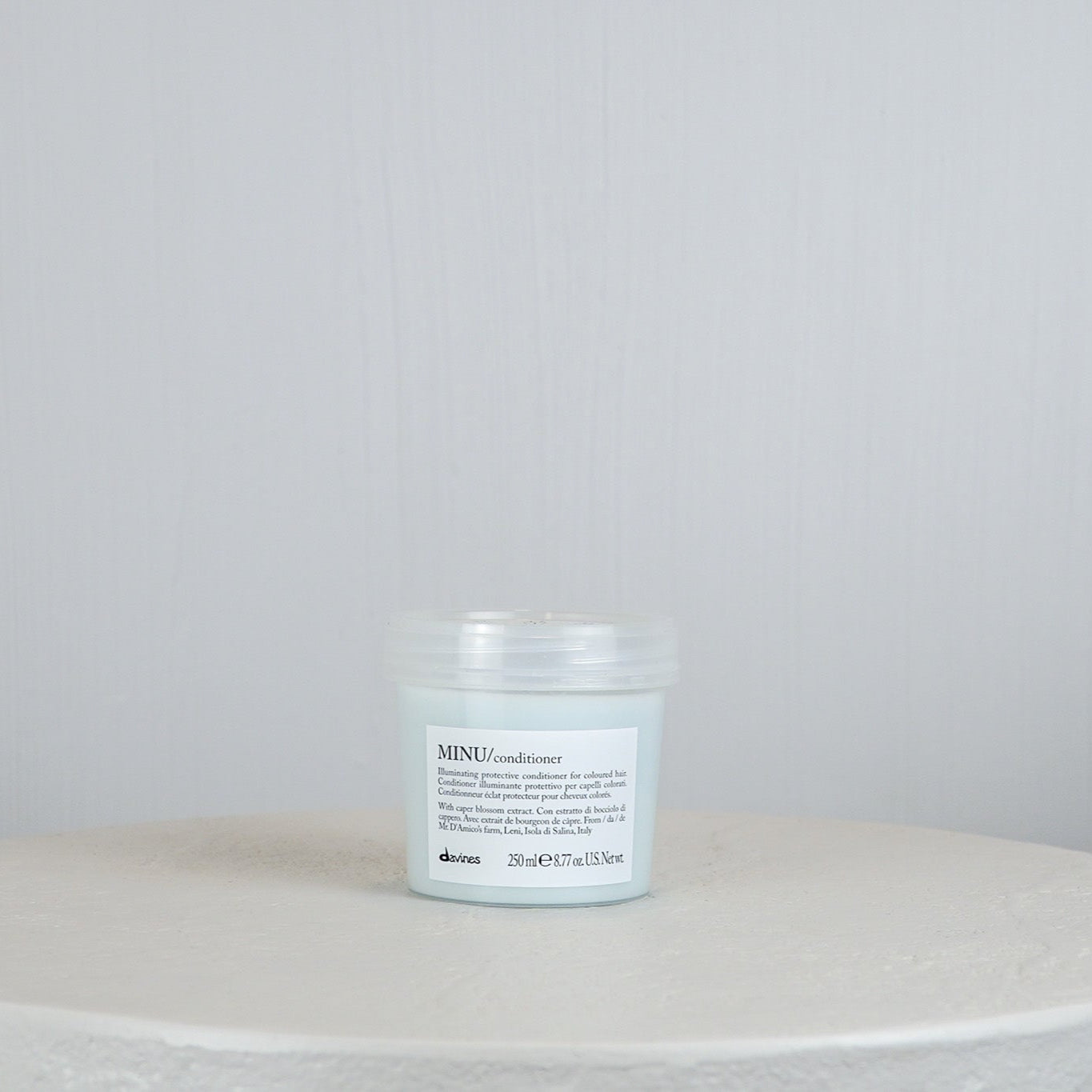 • Bottle of Davines MINU conditioner on a white surface with a light gray background