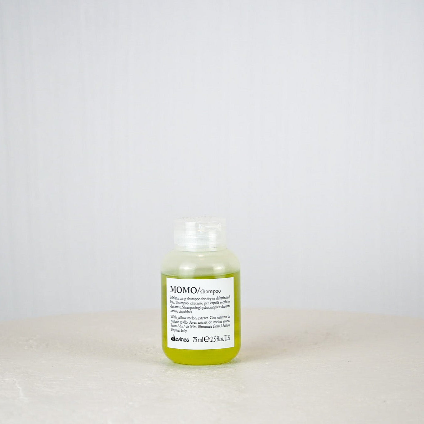 • Bottle of green shampoo labeled 'MOMO/shampoo' on a white surface with a light gray background