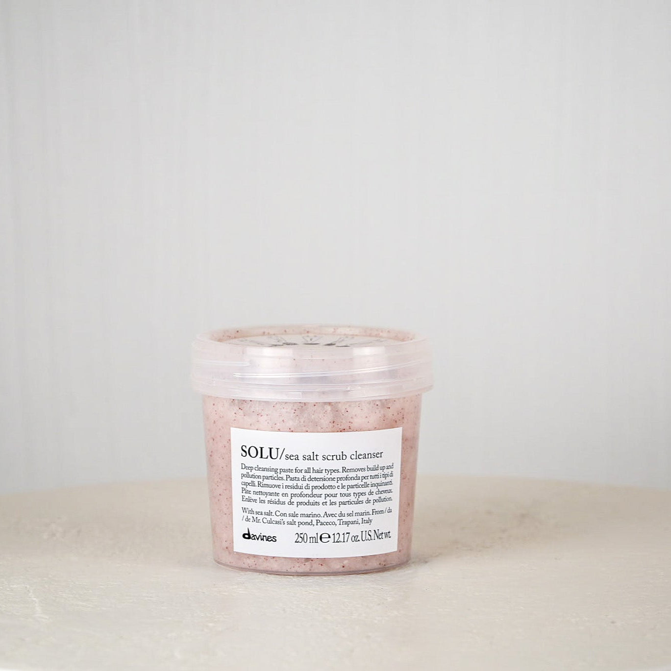 • Jar of Davines SOLU rose salt scrub cleanser on a white surface with a light gray background