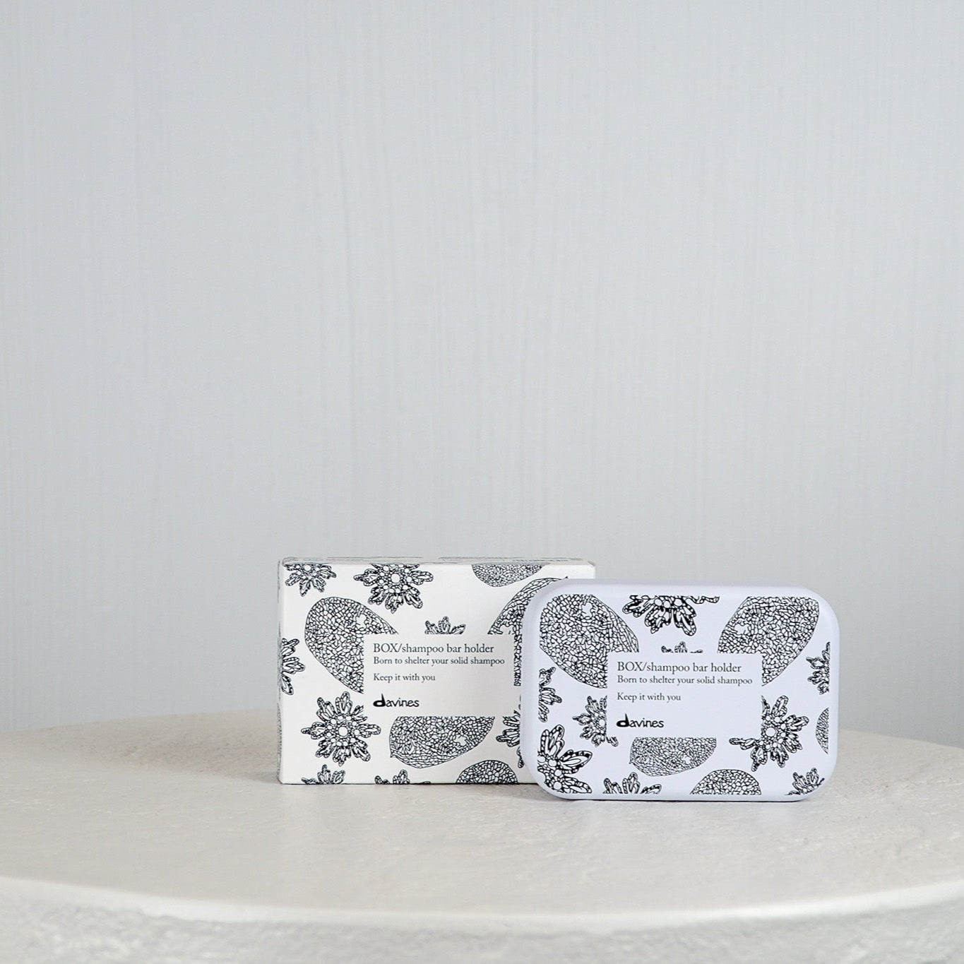 • Shampoo bar and holder packaging with floral design on a white surface and light gray background