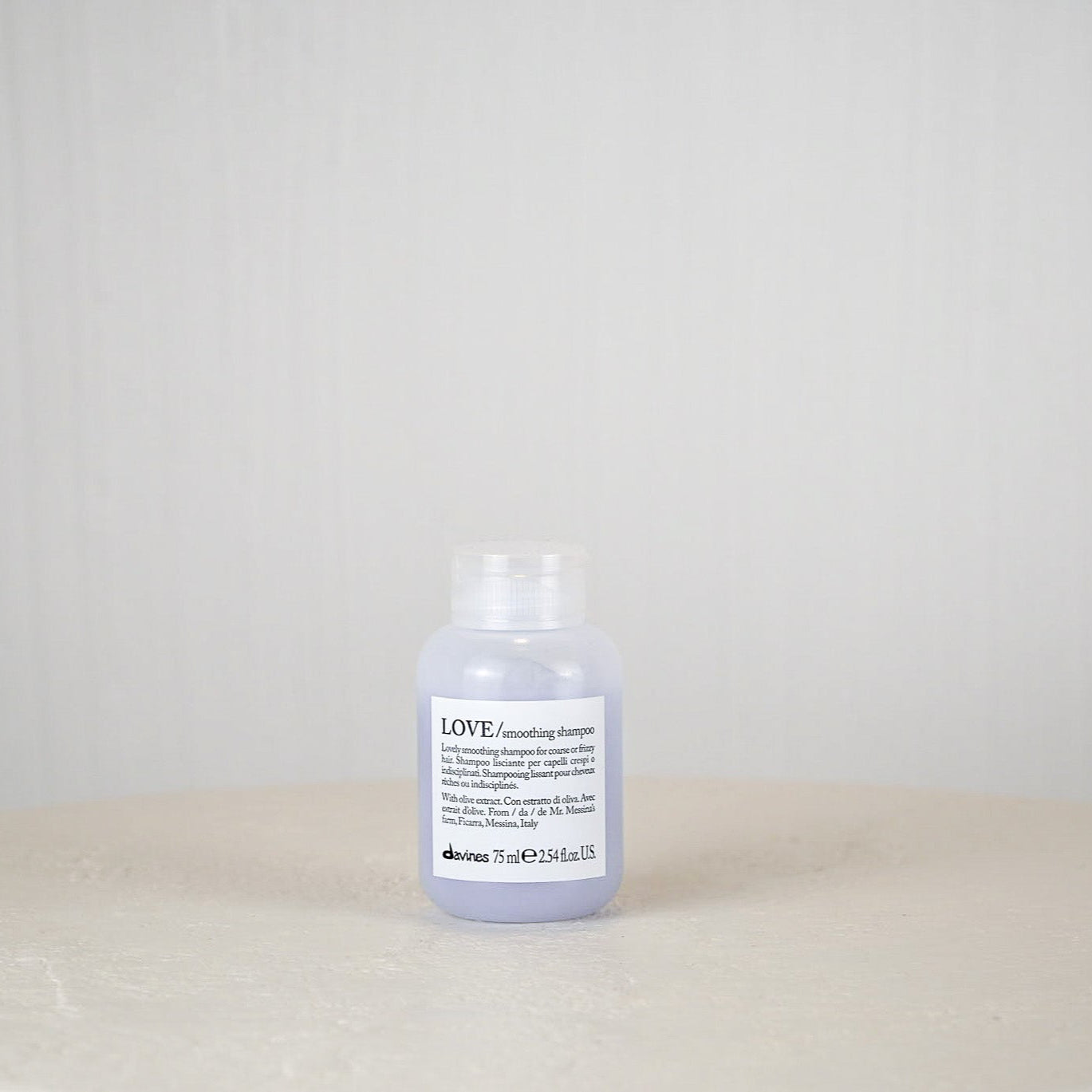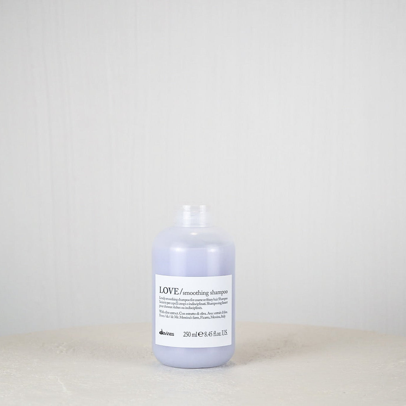 • Bottle of Davines LOVE smoothing shampoo on a light gray background