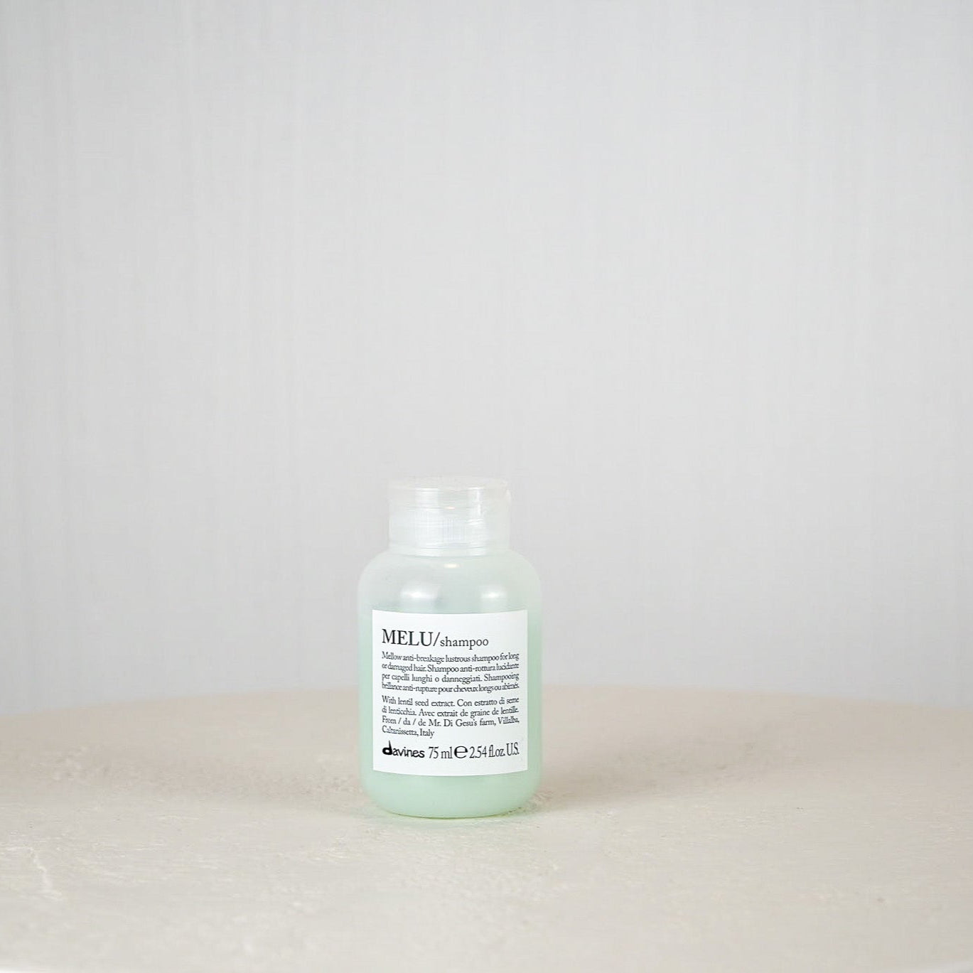 • Bottle of Davines MEU shampoo on a white surface with a light gray background